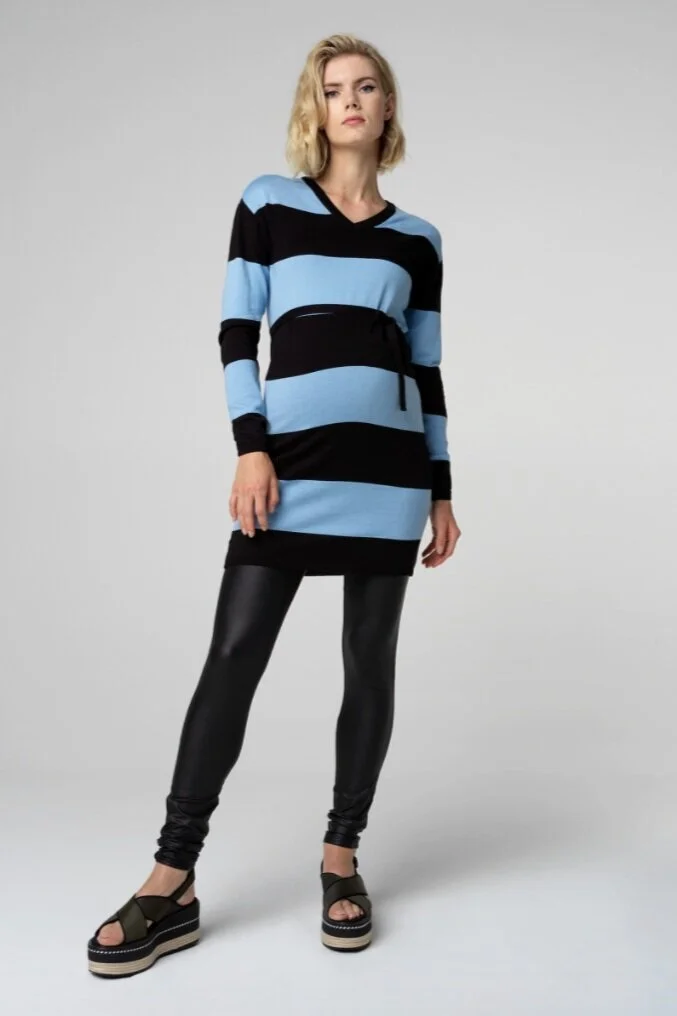 Be the MVP of your family in this blue & black striped sweater dress. Light knit fabric provides for aerated Chicago weather comfort - with extra room to grow! Pair with some black leggings or wear as a dress with boots. You’ll be the star of the team no matter how you fashion it!